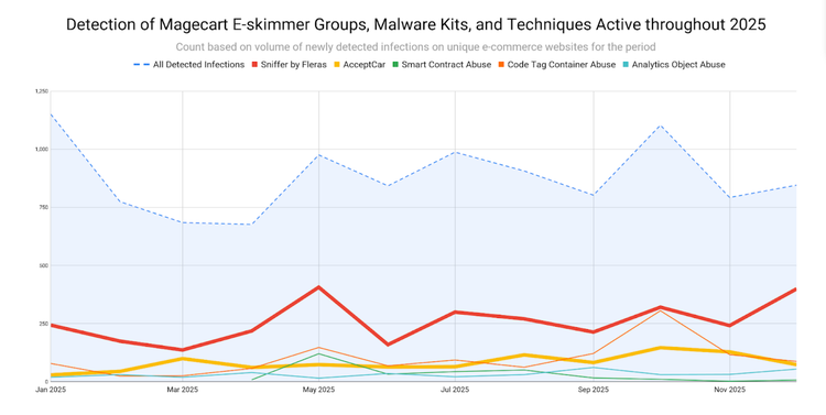The "Sniffer by Fleras" kit, responsible for 26% of all e-skimmer infections observed in 2025, includes a web-based portal for generating malicious scripts and a management server for stolen data. The result was more than 10,500 unique Magecart infections active at some point during the year, likely compromising more than 23 million transactions.