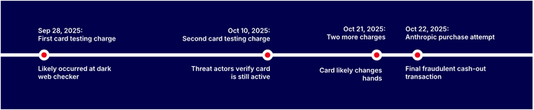 October 22, 2025: Fraudsters attempted a payment on Anthropic's platform. Though Anthropic detected and blocked the activity, the attempt demonstrates how fraud infrastructure directly supports advanced threat operations.