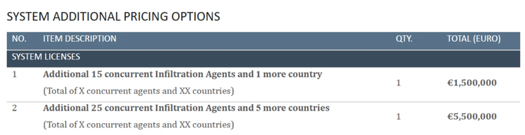 Ein durchgesickerter Candiru-Projektvorschlag, der von TheMarker, einer israelischen Nachrichtenagentur, veröffentlicht wurde , deutet darauf hin, dass Candiru ähnlich wie andere Spyware-Anbieter wie Intellexa seine Spyware nach der Anzahl der gleichzeitigen Infektionen lizenziert, was sich auf die Anzahl der Ziele bezieht, die zu einem bestimmten Zeitpunkt aktiv überwacht werden können. Ein Vorschlag in Höhe von 16 Millionen Euro erlaubt beispielsweise unbegrenzte Infektionsversuche, beschränkt aber die Überwachung auf zehn Geräte gleichzeitig. Kunden können diese Kapazität erweitern: Für zusätzliche 1,5 Millionen Euro können sie fünfzehn weitere Geräte überwachen und die Genehmigung erhalten, ein weiteres Land ins Visier zu nehmen. Für 5,5 Mio. EUR können sie 25 weitere Geräte überwachen und in fünf weiteren Ländern tätig sein (siehe Abbildung 3). Ein weiteres Upgrade im Wert von 1,5 Millionen Euro bietet eine Remote-Shell-Funktion, die vollen Befehlszeilenzugriff auf infizierte Geräte gewährt, was aufgrund seiner potenziellen Verwendung zum Hochladen von Dateien oder zum Einschleusen belastender Inhalte besondere Bedenken aufwirft.