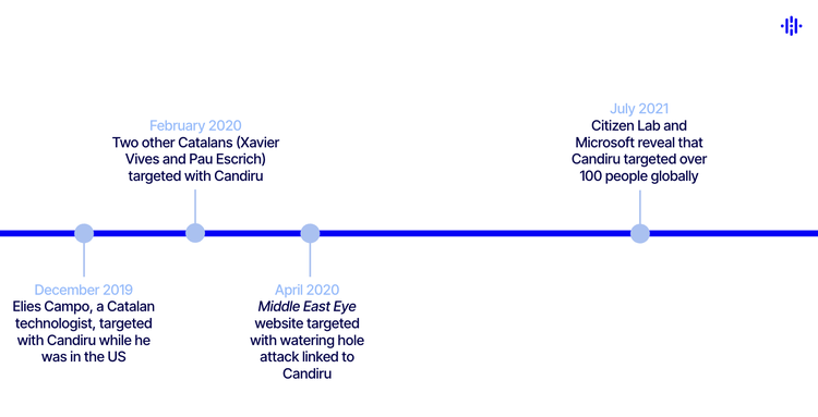 Im April 2022 berichtete Citizen Lab, dass Mitglieder der katalanischen Unabhängigkeitsbewegung im Rahmen einer von der spanischen Regierung genehmigten inländischen Überwachungsoperation mit der Spionagesoftware Candiru angegriffen wurden (siehe Abbildung 2). Berichten zufolge umfasste die Kampagne die Überwachung von gewählten Amtsträgern und politischen Aktivisten. Candiru wurde speziell verwendet, um vier Katalanen ins Visier zu nehmen, die in den Open-Source- und digitalen Wahlgemeinschaften arbeiten. Einem katalanischen Technologen, Elies Campo, wurde eine E-Mail mit einem Link zugeschickt , der, wenn er angeklickt worden wäre, zu einer Candiru-Infektion geführt hätte, während er in den USA lebte und eine US-SIM-Karte in seinem Gerät hatte. Darüber hinaus berichtete Citizen Lab über mutmaßliche Angriffe auf saudi-arabische Social-Media-Nutzer.