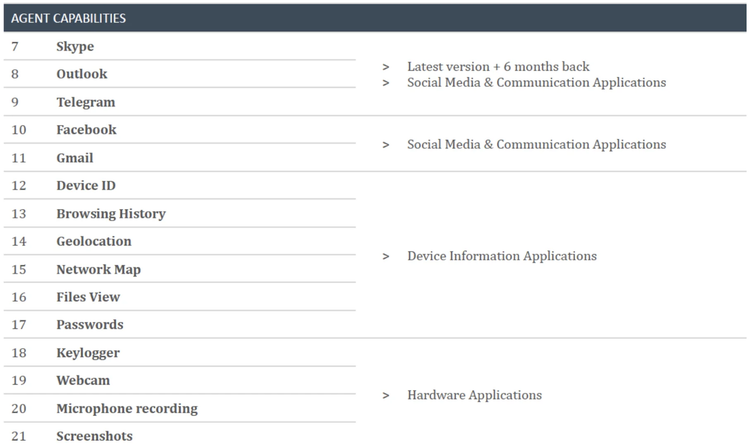 Die durchgesickerten Dokumente zeigen, dass die Spyware von Candiru für den tiefen Zugriff auf die Geräte der Opfer konzipiert wurde und die Extraktion von Dateien, die Sammlung von Browserdaten und sogar den Diebstahl verschlüsselter Nachrichten aus der Signal Messenger-Desktop-App ermöglicht. Abbildung 4 zeigt einen Auszug aus dem durchgesickerten Candru-Projektvorschlag, in dem die Windows-spezifischen Fähigkeiten der Spyware beschrieben werden.
