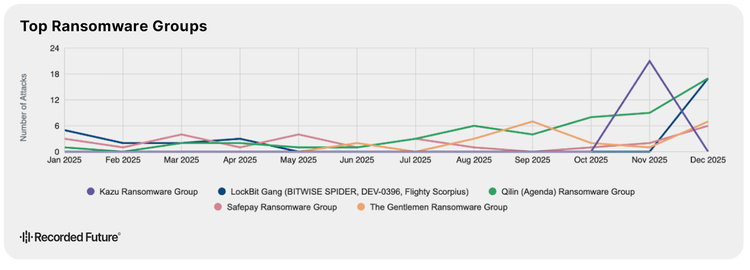 - Le score de risque d'intrusion dans le réseau de l'Argentine est passé de très faible à faible, et le score de risque de ciblage de ransomware de l'Argentine est passé de faible à moyen à la fin de l'année 2025. Insikt Group a observé que l'Argentine était la cible d'un nouveau ransomware à base de rouille, le "RALord".