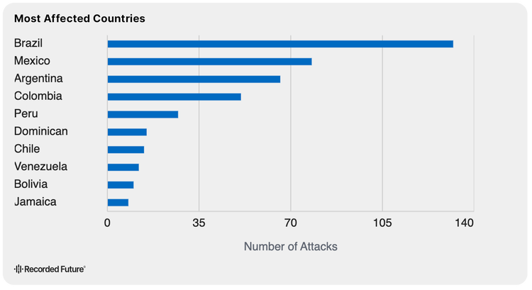 En ce qui concerne les pays de l'ALC, les cinq pays les plus touchés par les ransomwares dans la région ALC en 2025 étaient le Brésil (128 attaques), le Mexique (78 attaques), l'Argentine (63 attaques), la Colombie (51 attaques) et le Pérou (27 attaques). Ces pays comptent parmi les plus grandes économies de la région, ce qui peut entraîner des retombées en aval pour les entreprises qui font des affaires directement avec eux ou avec les pays voisins. Insikt Group a constaté que la majorité des groupes de ransomware recourent à la double extorsion. Cette extorsion TTPs consiste à crypter les données d'une victime, à les exfiltrer, puis à menacer de les divulguer publiquement sur le blog du groupe de ransomware si la rançon n'est pas payée. Recorded Future évalue chaque trimestre les risques d'intrusion dans les réseaux et de ciblage des ransomwares par pays afin de sensibiliser les entreprises et de les aider à évaluer leur exposition aux risques. Voici ce qu'il faut retenir des cinq pays les plus touchés, d'après les mesures et l'analyse de Recorded Future :