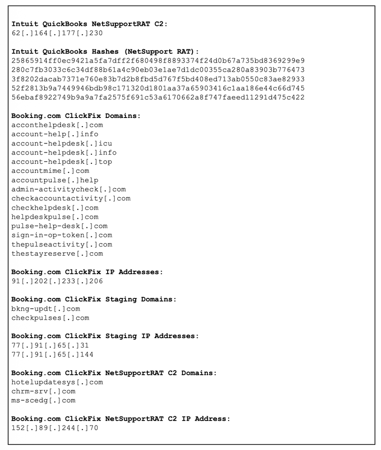 Insikt Group 、ClickFixのソーシャルエンジニアリングの手法TTPsを利用してホストシステムへの初期アクセスを容易にする、5つの異なるクラスターを特定した。 少なくとも2024年5月以降に確認されたこれらのクラスターには、財務アプリケーションのIntuit QuickBooksや旅行代理店Booking.comになりすますものなどが含まれる。Insikt Groupは、Recorded Future ® HTMLコンテンツ分析データセットを活用し、埋め込まれたWebアーティファクトを体系的に監視することで、新たな悪意のあるドメインやインフラストラクチャを特定し、追跡しました。