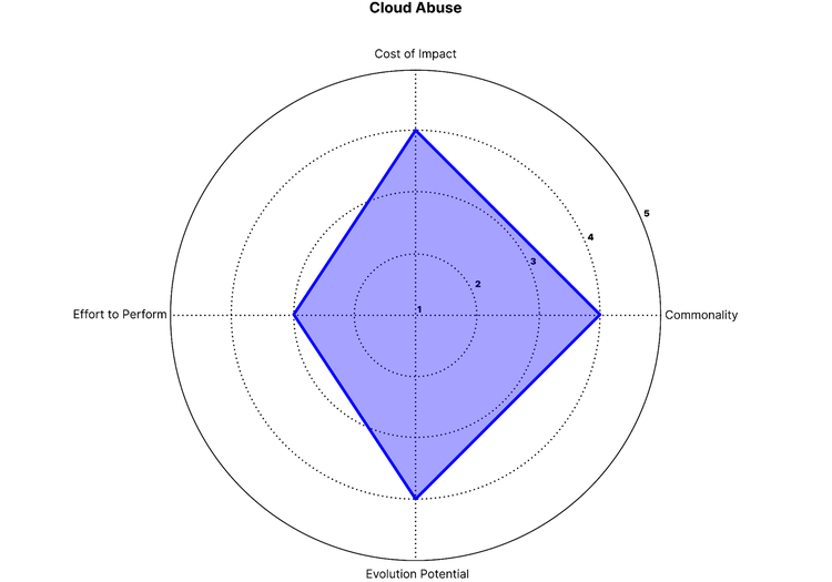 合法的に登録されたクラウドインフラの悪用と侵害の両方、被害者のクラウドインフラは、脅威アクターに中程度の困難をもたらします。 前者の脅威タイプでは、攻撃者は大規模なクラウドプラットフォームに匿名で登録し、検出されることなく悪意のあるアクションを実行する方法を決定し、同時に環境に料金を支払う必要があります。後者の脅威タイプでは、脅威アクターは、包括的な目標を達成するために必要なクラウドサービスやシステムを適切に侵害した後にのみ、被害者のクラウドインフラストラクチャを悪用することができます。