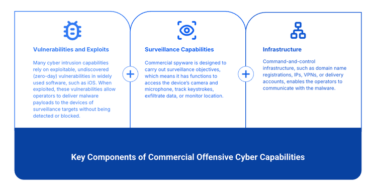 商用の攻撃的サイバー機能には、脆弱性とエクスプロイト、監視に重点を置いたマルウェア、民間ベンダー(主に政府向け)が販売するコマンドアンドコントロール(C2)インフラストラクチャが含まれます。80 か国以上がこのようなツールを使用しています。