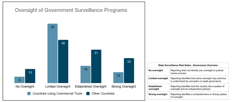 リスクの2番目のカテゴリーは、人権と公民権の侵害です。Recorded Future の国別リスクデータによると、市販の監視ツールを使用していることが確認された国の 63% では監視能力が限られており、監視活動を監視および抑制できる独立した司法機関または監視機関が不足しています。世界中の数十カ国が、政治的反体制活動家、ジャーナリスト、弁護士などに対して商用の監視ツールを導入している。NSOグループが開発したペガサススパイウェアは、 2018年にトルコのサウジアラビア領事館でジャーナリストのジャマル・カショギ氏が殺害された 後、同氏とその家族および関係者のデバイスで 発見され た。各国は監視技術を利用して標的に嫌がらせや脅迫を行い、プライバシー、言論や集会の自由、移動の自由、その他の人権を侵害している。これはメキシコ、ギリシャ、スペインなどの民主主義国家で発生しており、監視ツールの悪用は権威主義体制に限った問題ではなく、世界的な課題であることを浮き彫りにしている。