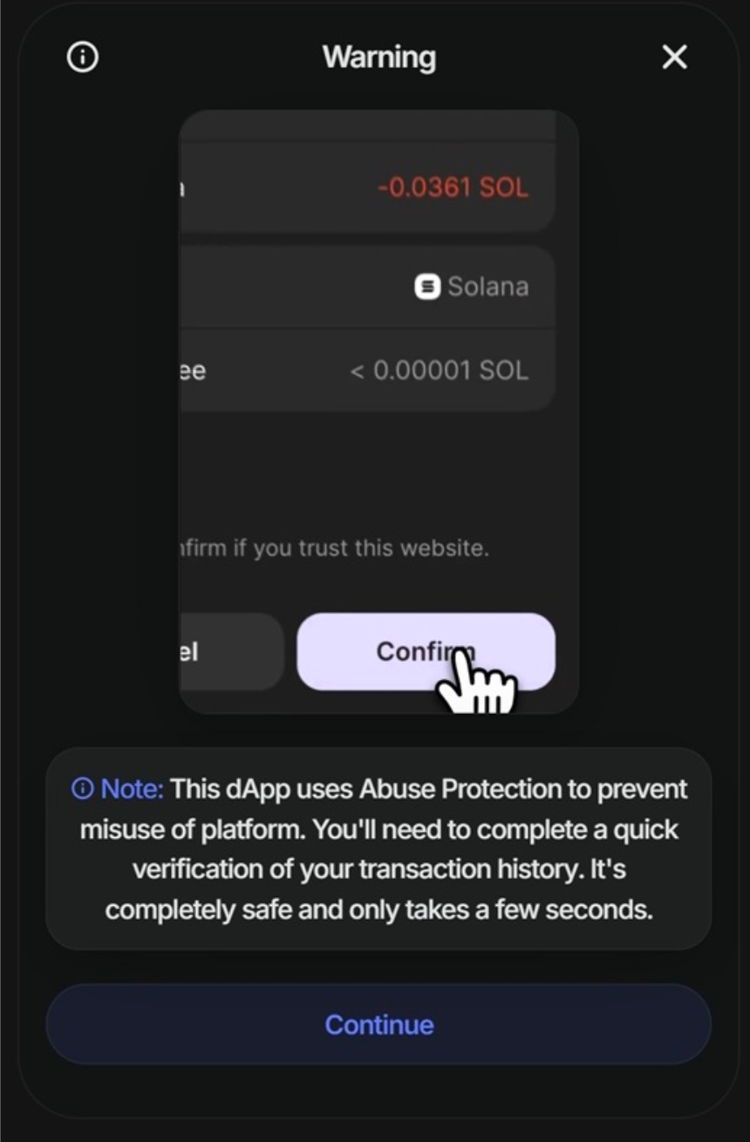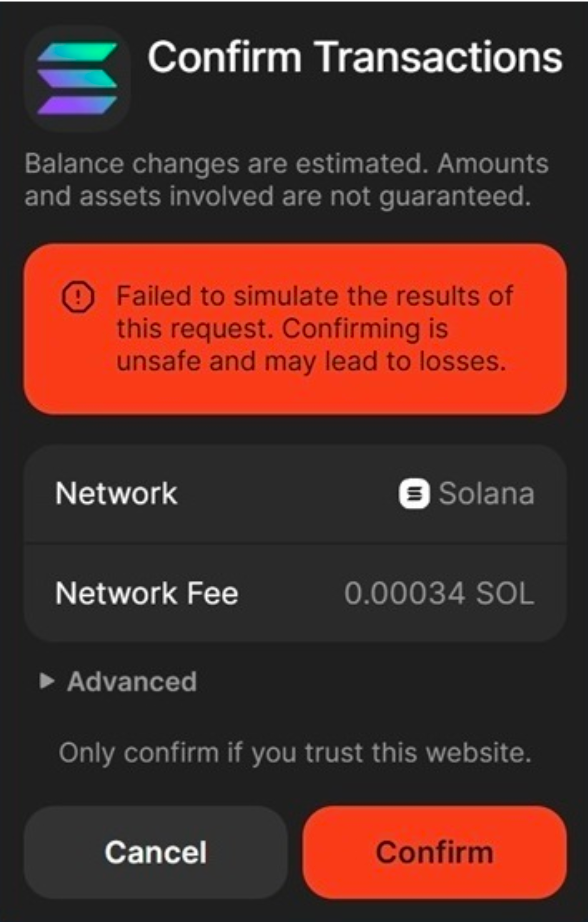 - 「クラッシャー」 : これは、ユーザーレビューを最小限に抑えて 1 回のやり取りで完了するように設計された、ステルスに重点を置いたドレインです。Phantom は、正規のサイトでよく見られる一般的な警告を表示し、親しみやすさを通じて疑いを軽減します。偽のインバウンドアクティビティや払い戻しの説明はありません。このモードは実験的なものと考えられており、モバイル デバイスではハニーポットの動作に置き換えられます。