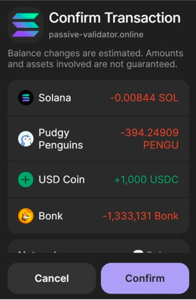 - 「ハニーポット」 : このモードでは、偽の着信トークンまたは SOL 領収書を利用して、目に見えるドレイン トランザクションを開始する前にユーザーを準備します。ドレインは送信転送として表示されますが、Phantom はそれを危険としてフラグ付けしません。偽のレシートは、Phantom の UI を通じてインストール可能なトークン (任意のカスタム トークンではない) に対してのみ正しくレンダリングされます。モーダル ウィンドウは、流出した資産が 2 番目のトランザクションを通じて返還されると誤って主張します。
