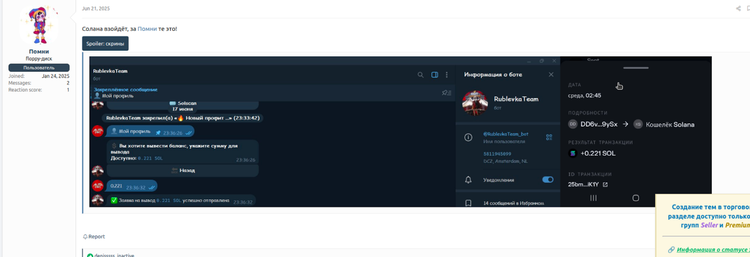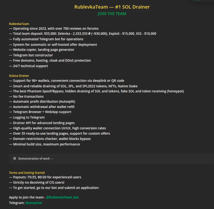 Rublevka Team の LolzTeam フォーラムへの最新投稿は、2025 年 4 月 18 日に denisssss_inactive によって公開され、Rublevka Team の SOL ドレイナー詐欺プログラムを宣伝しています。Rublevka Teamが仮想通貨取引所詐欺とTONトークンキャンペーンを宣伝する最初の投稿以来、支払い率はアフィリエイトに有利な方向に大きく変化し、「経験豊富なユーザー」の場合は開始率がそれぞれ75%と80%となっている。新規アフィリエイトのコミッション率の増加は、脅威グループが達成した経済的成功に基づいて、チームの収益化戦略が時間とともに変化したことを示している可能性があります。つまり、個々のアフィリエイトから最大限の収入を引き出すよりも、従業員のプールを拡大する方が有利になっている可能性があります。