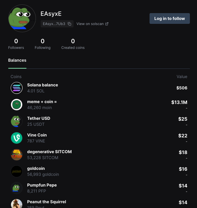 Insikt Groupは、ユーザーが独自のミームコインを発行できるプラットフォームであるpump[.]fun上のアドレスAに関連付けられたアカウントも特定しました。このアカウントは 600 を超えるトークンの低残高を保持しており、2025 年 9 月 22 日の Fixed Float Exchange からの取引によって最初に資金が提供されました。