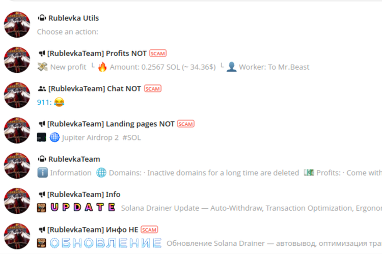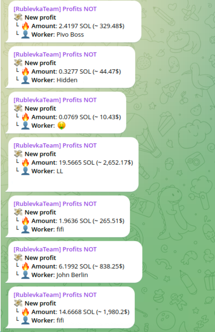 - 執筆時点では、Rublevka Team のメイン Telegram チャンネルには約 7,000 人のメンバーがいます。Rublevka チームの自動化された「利益」チャンネルには 24 万件を超えるメッセージが投稿されており、少なくとも 24 万件のウォレットからの資金流出が成功したことが示されている。取引額は 0.16 ドルから 2 万ドル以上に及んでいる。