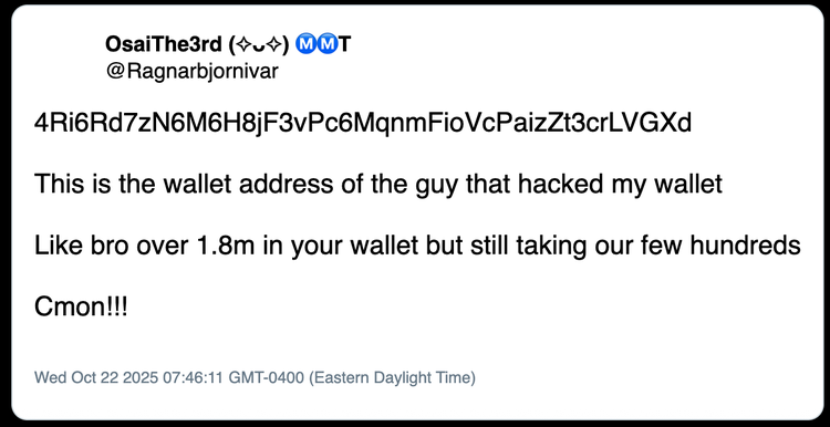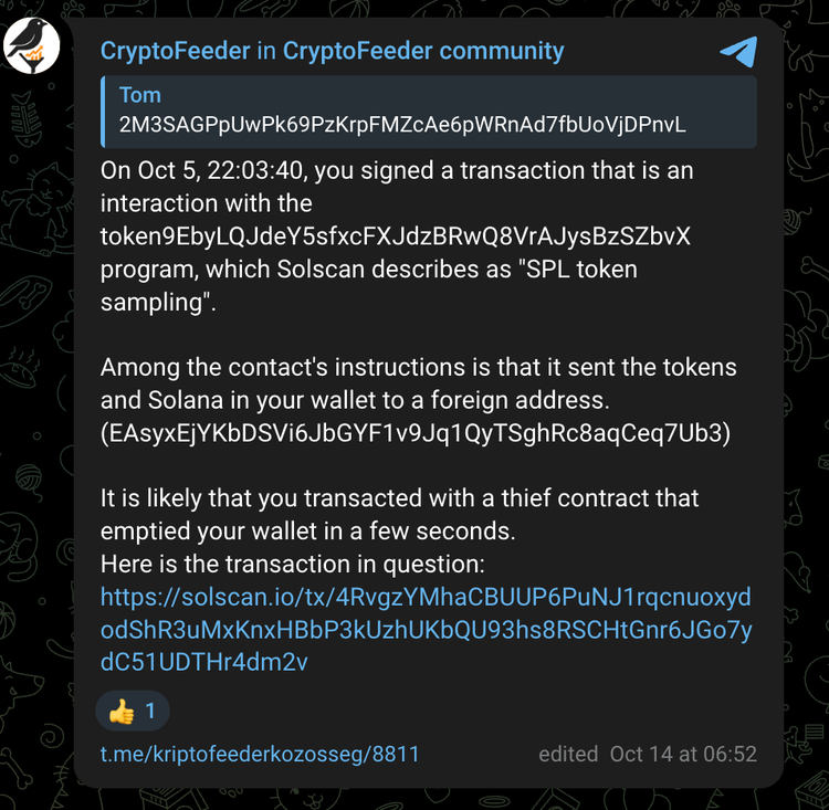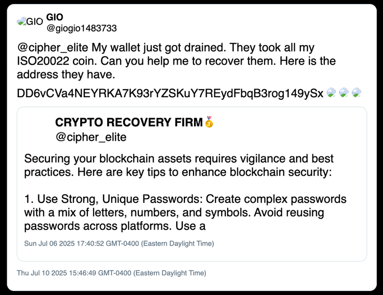 上記に加えて、 Insikt Group 、2025 年 4 月から 10 月の間に行われた、他の公開情報ソース内のドレイナー ファイルに含まれる SOL アドレス (アドレス A から E を含む) の不正使用報告 28 件を特定しました。 ユーザーからは、これらのアドレスによって資金が流出したさまざまな詐欺行為が報告されています。これらの詐欺には、Telegram、ソーシャルメディア、暗号通貨投資アドバイスグループで共有されたウェブページが関係しており、ユーザーにウォレットを接続してトランザクションに署名するよう促し、結果としてすべての資金が失われました。これらのレポートに記載されているTTPsと時間枠は、Rublevka Team に関連するものと一致しており、これらのレポートは Rublevka Team の被害者によって作成された可能性が高いと評価しています。 注目すべきことに、少なくとも 1 件のレポートでは、ウォレットの資金が流出したことに加えて、個人データとアカウントの侵害を経験したとユーザーが報告しています。これは、Rublevka Team の関連会社の一部が、詐欺の一環として認証情報の盗難などの追加のフォローアップ活動を行っている可能性があることを示唆している可能性があります。これらのレポートに記載されているドメインと悪意のあるソーシャル メディア アカウントの完全なリストについては、付録 C を参照してください。