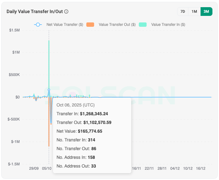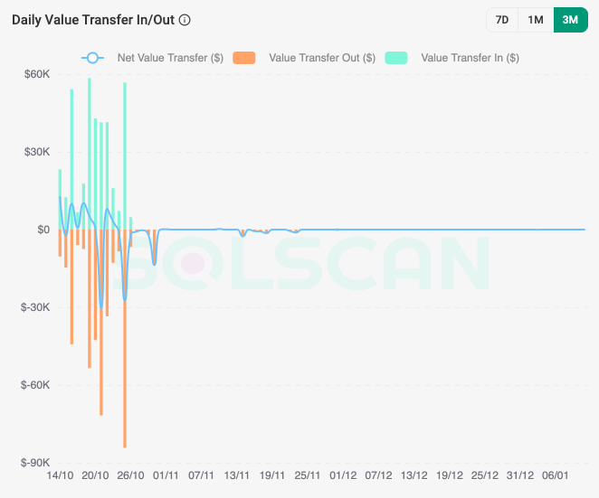 アドレス A とアドレス B は両方とも、JavaScript ドレイナー コードに base64 でエンコードされた文字列として含まれており、脅威アクターがこれらの特定のアドレスをさらに難読化しようとしたことを示しています。一方、その他のアドレスはすべてプレーンテキストで利用可能でした。 SOLブロックチェーンデータに基づくと、アドレスAは、ドレイナーJavaScriptファイル内で特定されたアドレスのうち、関連トークンアカウント(ATA)に対応する31の「所有者」としてリストされています。そのため、これらの ATA は、ほぼ確実にドレイナー ロジックの一部として使用されます。さらに、このアドレスは、互換性のあるブロックチェーンで使用したり、互換性のあるブロックチェーンにスワップしたりするために、ラップされた SOL (wSOL) への変換を頻繁に行っているようです。Insikt Group は、2025 年秋にアドレス A が同じ日に多額の入出金を行うパターンを示し、数週間にわたって毎日 50,000 ドルから 80,000 ドルがウォレットを介して移動していることを確認しました。2025 年 10 月 6 日に、約 120 万ドル相当の資産がこのアドレスに送金されました。このパターンは、このウォレットが、盗んだ資金を換金する前に送金および洗浄するための手段として Rublevka チームによって使用された可能性が高いことを示唆しています。SOLブロックチェーンデータによると、このアドレスは2025年9月に初めて使用されるようになった。
