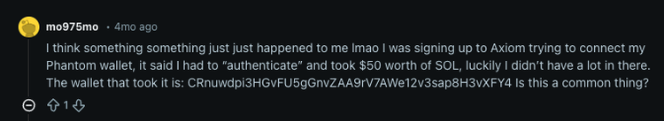 アドレス B に関連付けられたアカウントは現在 100 を超えるトークンを保有しており、大量のトークン交換アクティビティに関連付けられています。注目すべきは、アドレス B の最初の資金提供者はアドレス C であり、これは 2025 年 7 月から 8 月の間にいくつかのソーシャルメディア投稿で悪意のあるウォレットとして言及されていたことです。これは2025年8月のRedditのスレッドでも言及されており、ユーザーらは資金が盗まれたことについて話し合っていた。あるユーザーは、Axiom にサインアップし、Phantom ウォレットをサービス Web サイトに接続したところ、認証後にサービス側がウォレットから 50 ドル相当の SOL を引き出し、アドレス C に送金したと述べています。ウォレット アドレスとTTPs (Axiom をテーマにしたランディング ページと Phantom ウォレットを使用) に基づいて、この人物は Rublevka Team の別の被害者である可能性が高いと評価しています。