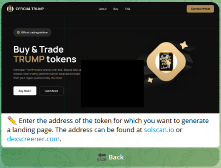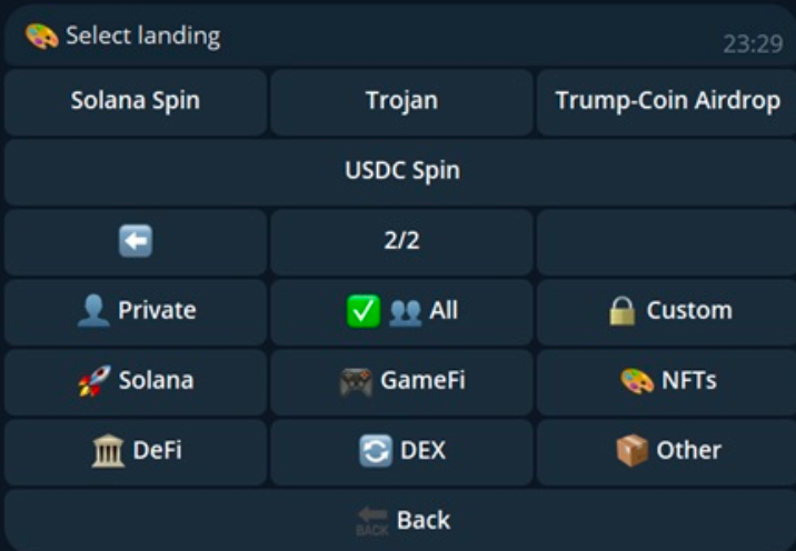 この投稿では、操作を実行するための完全に自動化された Telegram ボット、ランディング ページ ジェネレーター、クローキング機能と分散型サービス拒否 (DDoS) 保護機能を備えた無料のドメインとホスティング サービスも宣伝されています。広告では、ランディングページで使用されているSOLドレイナーについても説明されています。このドレイナーは、90種類以上のウォレットタイプ、SOL、 Solana Program Library (SPL)トークン(SPL2022拡張トークンを含む)、非代替トークン(NFT)、 Native Stakeのドレイニング機能、ファントムウォレットのスプーフィングおよびバイパス機能、ドレイナーAPI、およびドレイナーと統合された35以上のすぐに使用できるランディングページをサポートしています。