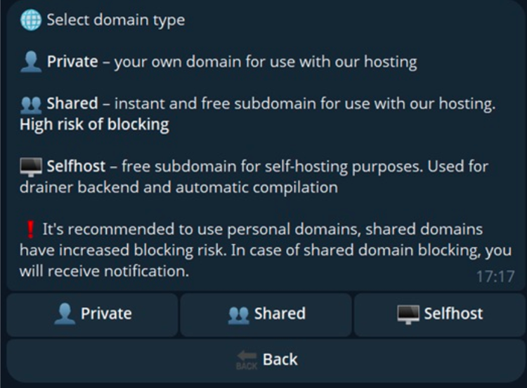 - 「セルフホスト」 : このオプションを使用すると、アフィリエイトは、自分のプライベートにホストされている Web サイトからスクリプトを呼び出す目的で、Rublevka チームが運営するドメインで SOL ドレイナー バックエンドを無料でホストできます。