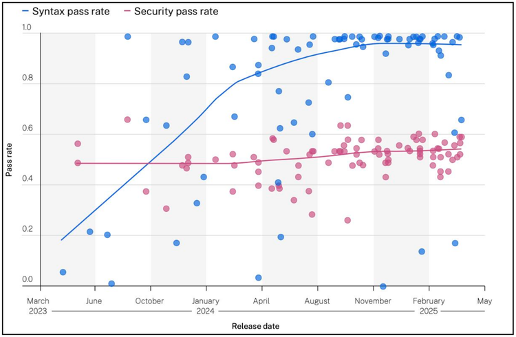 図 3: LLM のセキュリティと構文の合格率と LLM のリリース日の比較 (情報源: Veracode)