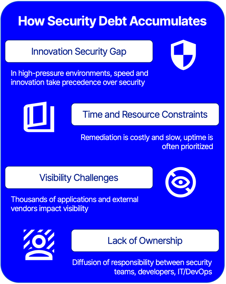 セキュリティ負債とは、組織の技術スタック全体に蓄積された未解決の脆弱性、過剰な権限、古い構成のバックログを指します。現代の企業の約 74% が何らかのセキュリティ負債を抱えており、そのほぼ半数が、長期にわたる、非常に深刻で、悪用される可能性のある欠陥が組み合わさった「重大な」負債を抱えています。金融債務と同様に、担保債務にも「利息」が発生し、時間の経過とともに解決が複雑になり、費用もかかります。