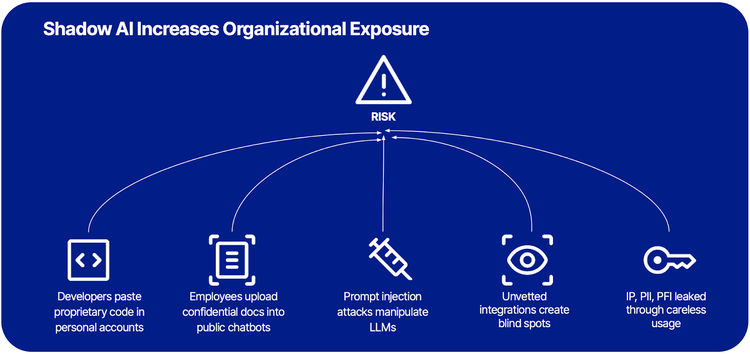 課題をさらに複雑にしているのは、「シャドー AI 」の増加、つまり IT 部門の可視性と制御の外で AI ツールを許可なく使用することです。開発者は独自のコードを個人の AI アカウントに貼り付ける可能性があり、従業員は機密文書をパブリック チャットボットにアップロードする可能性があります。AIを不注意に使用すると、知的財産、個人データ、財務記録などが簡単に漏洩する可能性があります。迅速な注射