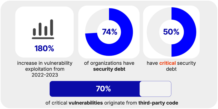 サードパーティへの依存とシャドーAI導入により、露出が拡大します。重大な脆弱性の 70% はサードパーティのコードに起因し、シャドーAIによって機密データが漏洩してコンプライアンスの盲点が生じ、長期的なセキュリティ負債が気づかれずに増加します。
