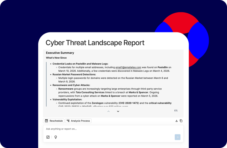 Your threat reports are done and delivered with AI Report Creation. Compress hours of analyst writing into minutes, producing template-based or custom reports that are fully referenced and attributable to platform data.