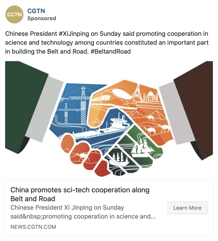 However, none of the advertisements run by Xinhua or China Daily on Facebook that were retained as part of the “political” archive over our research period were annotated in the Facebook platform as “paid for by” at the time they were run. Therefore, users viewing the posts during the period in which they were active would not have known that the advertisements were deemed overtly “political” or of national importance, or even that they were ultimately purchased by the Chinese state.