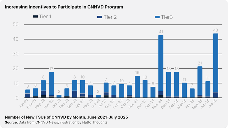 China continues to expand its network of CNNVD technical support units (TSUs) and related programs, increasing its overall research base. TSUs are specialized organizations, often universities, state-linked labs, and cybersecurity firms that directly feed vulnerability research and intelligence into the national system. Since 2021, the number of TSUs has increased significantly, broadening the state’s research capacity and deepening its ability to identify and operationalize software flaws at scale.