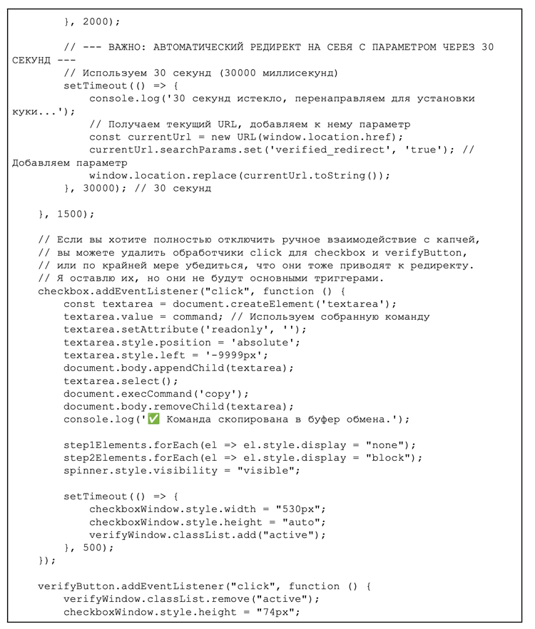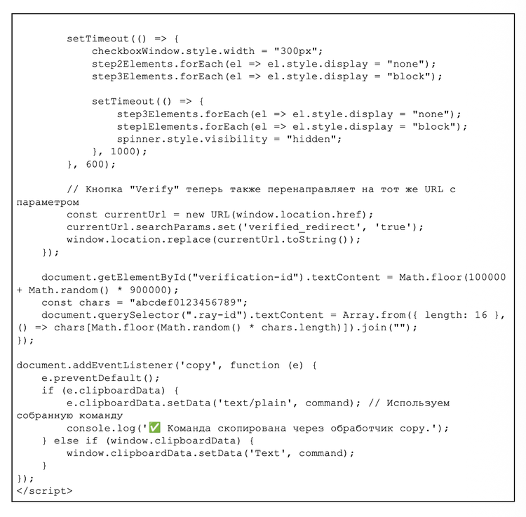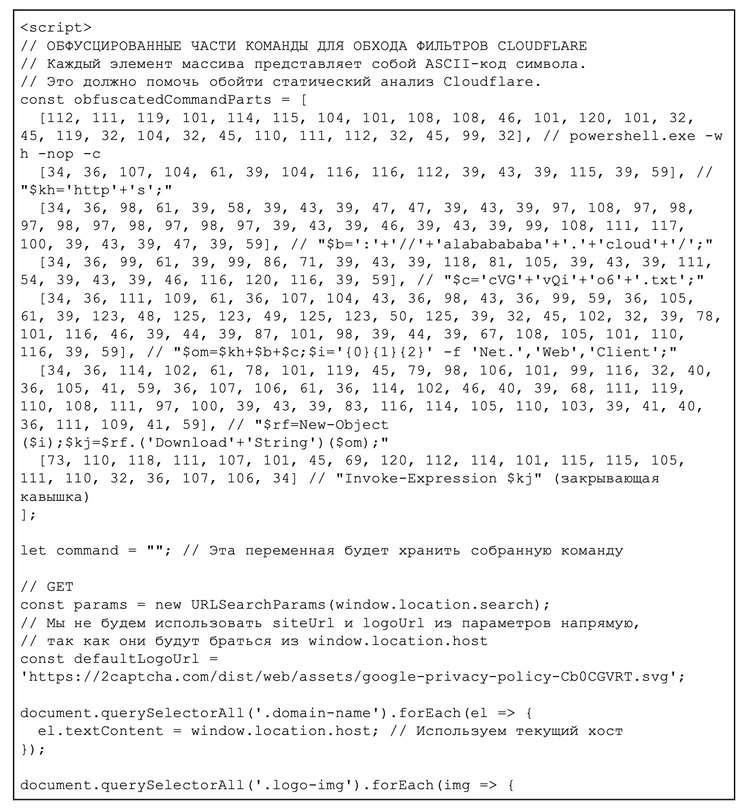Furthermore, a comment written in Cyrillic at the beginning of the script translates to, "This should help bypass Cloudflare static analysis". This internal documentation suggests the threat actor is purposefully detailing their actions to refine bypass techniques against security scanners.
