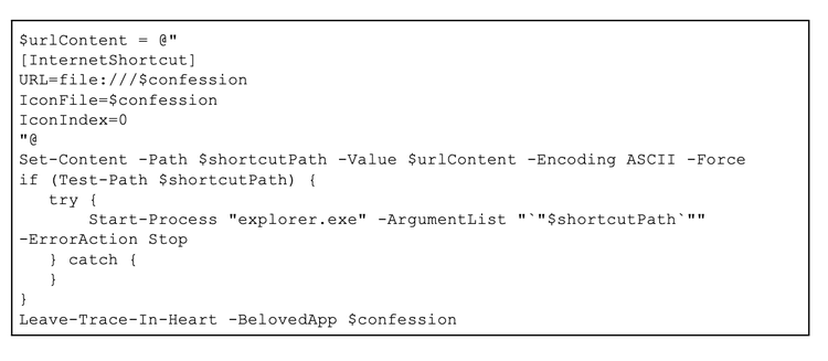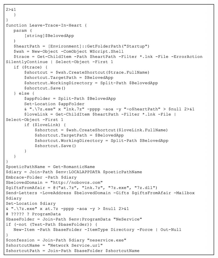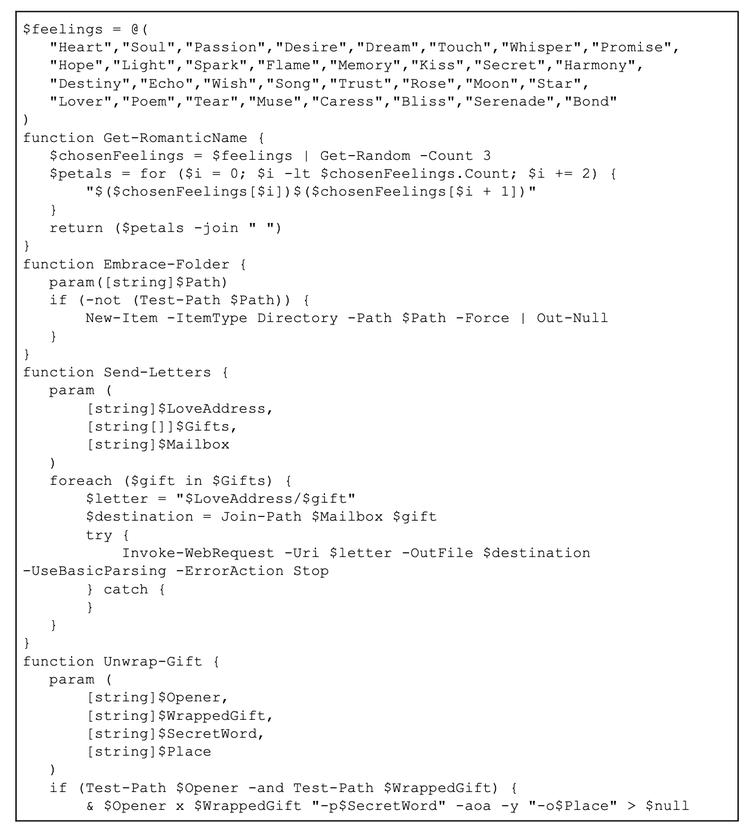 The bibi.php script is essential for the final deployment phase and for obfuscating on-disk artifacts. It contains a function called Get-RomanticName, which selects and combines strings from a thematic wordlist, including terms such as "Heart", "Soul", and "Desire", to generate a randomized folder name under %LOCALAPPDATA%, where the staging files are placed.