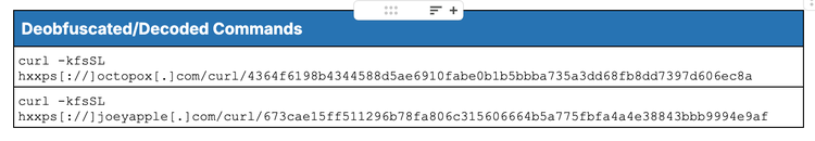As shown in Table 10, the revealed curl instruction uses a compound set of arguments, in this cluster, -kfsSL, to facilitate silent delivery. These flags ensure that Transport Layer Security (TLS) certificate checks are bypassed, server-side errors are suppressed, and the process remains hidden from the user's view while following redirections to reach the final payload domain.