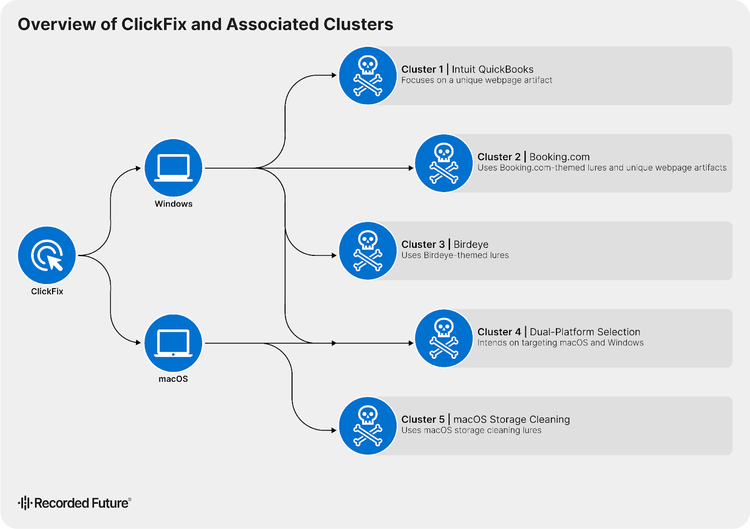 Insikt Group identified five clusters (see Figure 1) that exhibited significant operational variance despite a shared reliance on the ClickFix social engineering technique. These clusters were defined by their infrastructure patterns and targeting approaches, ranging from logistics-themed lures to dual-platform selection logic. This indicates that the ClickFix methodology is being deployed across a fragmented ecosystem of threat actors, each tailoring the technique to suit their own delivery requirements and victim profiles.