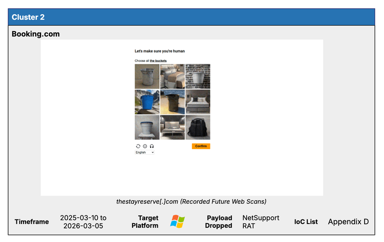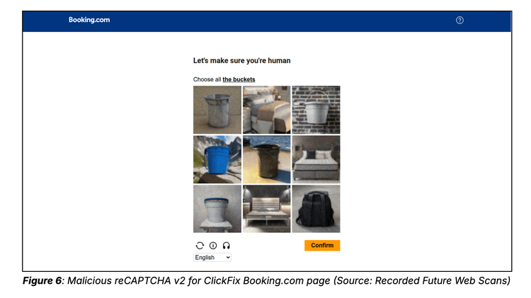 Cluster 2 was observed operating from February 2026 to the time of writing, impersonating the travel agency Booking.com. Insikt Group tracked the cluster by pivoting on a unique DOM hash made possible by the threat actor’s repeated use of a unique HTML title and consistent image files. Indicators of compromise (IoCs) tagged in this cluster can be seen in the Recorded Future HTML Content Analysis. The landing pages for this cluster use a counterfeit reCAPTCHA v2 challenge, requiring victims to select all photos containing a "bucket" (Figure 6). Insikt Group observed that the same challenge photos are presented in the same order across all analyzed pages.