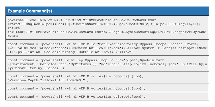 -wINDoW MiNI, -wi mi, or -w h)irm) with Invoke-Expression (iex).Substring() or .Replace() to "build" commandsiex to bypass static signature detections.Table 14: Observed TTPs for Windows (PowerShell) commands (Source: Recorded Future)