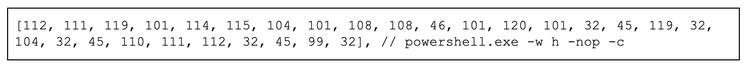 Analysis of the JavaScript within the DOM for this cluster, provided in Appendix F, revealed insights into the threat actor's methods. A notable portion of the script uses seven obfuscated lines that are concatenated into a single string to be attached to the victim's clipboard. The developer left comments within the code that detail the deobfuscated purpose of each line. For example, one comment explicitly identifies the portion of the command calling PowerShell with specific flags (Figure 13).