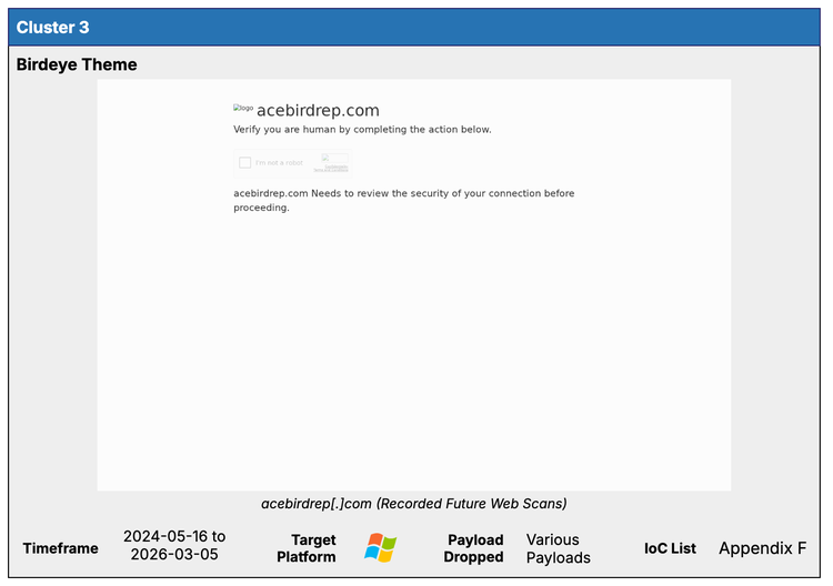 Cluster 3 was observed operating from May 2024 until the time of writing. Previously reported on by Insikt Group, this cluster uses infrastructure centered on domains incorporating the keyword "bird" to deliver its ClickFix lure pages, trackable in Recorded Future’s HTML Content Analysis. These lures spoof Birdeye, an AI marketing company, to manipulate victims into executing malicious commands.