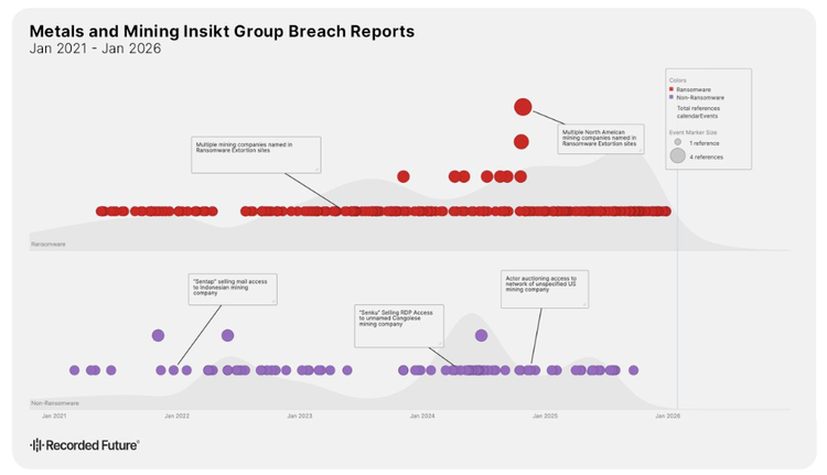 Figure 9: Timeline from January 2021 to January 2026 showing mining companies being named on ransomware extortion sites,