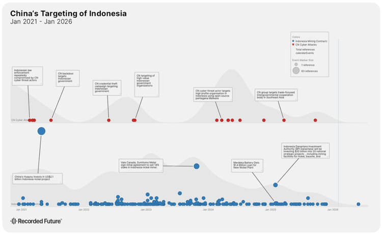 Between January 2021 and January 2026, Insikt Group identified multiple sophisticated cyber operations targeting Indonesia. While not every intrusion can be conclusively attributed to mining activity, these attacks align with China’s strategic interest in Indonesia’s natural resources; for example, Chinese companies control about 75% of Indonesia’s nickel refining capacity. Furthermore, Indonesia holds approximately 55 million metric tons of nickel reserves, which is over 40% of global reserves.