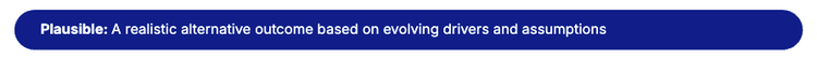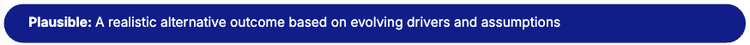 - Plausible: A realistic alternative outcome based on evolving drivers and assumptions