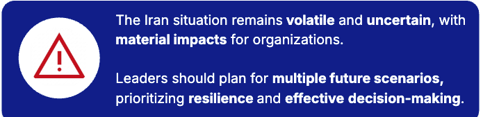 For each PESTLE-M category, we identified key drivers that could increase or decrease the likelihood of escalation, de-escalation, or sustained instability, and assessed how these dynamics may evolve under different assumptions. These were combined to develop six scenarios: one baseline, two plausible (best and worst case), and three wildcard scenarios, enabling organizations to evaluate how the conflict may unfold and the potential impacts on their operating environment.