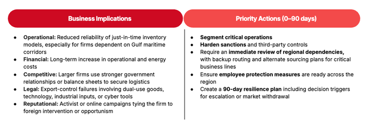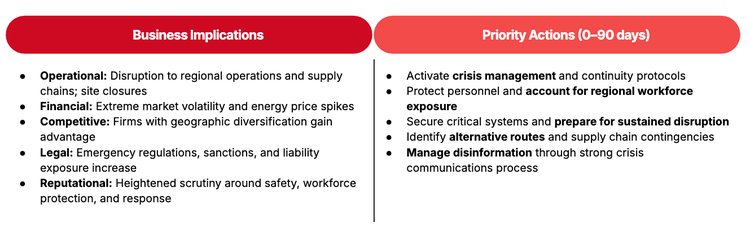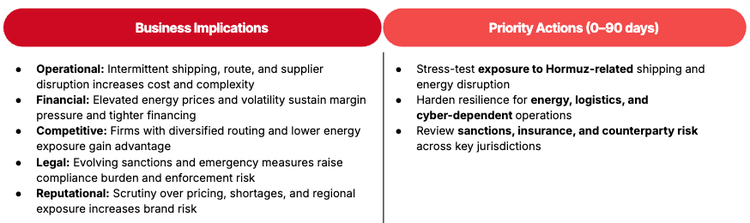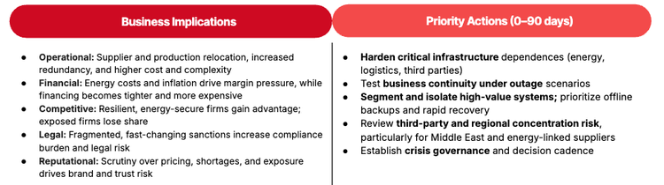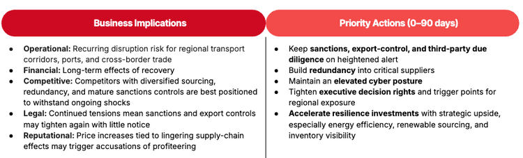 A temporary ceasefire breaks down following renewed strikes and failure to secure maritime access. Iran escalates missile and proxy attacks, including targeting Gulf energy infrastructure. With critical thresholds crossed, Saudi Arabia, the UAE, and Bahrain enter the conflict directly to protect economic and political stability. The Strait of Hormuz and Bab al-Mandab become sustained conflict zones, with repeated attacks, mining, and vessel seizures. Shipping and insurance markets withdraw at scale, severely constraining global energy flows. Energy prices surge, driving inflation and recession risk globally. Fuel shortages emerge in import-dependent economies, triggering industrial slowdowns, reduced mobility, and rolling outages. Cyber operations escalate into coordinated campaigns targeting energy, logistics, and financial systems. Legal fragmentation accelerates, with overlapping sanctions regimes, asset controls, and enforcement actions constraining cross-border operations. Russia exploits elevated energy revenues and reduced Western focus to press its advantage in Ukraine. China remains indirect but leverages Western overstretch to increase pressure on Taiwan.