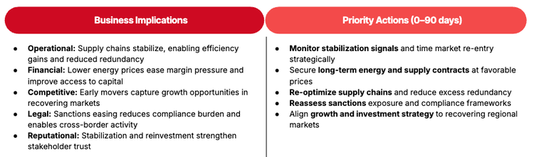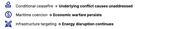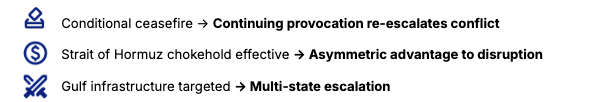 A fragile ceasefire reduces the pace of direct military exchanges strikes, but the drivers of conflict remain unresolved. Iran lacks the capacity for decisive escalation but retains asymmetric leverage, while the US prioritizes energy market stability and conflict containment. The Strait of Hormuz reopens only intermittently, with recurring disruptions, inspections, and security incidents, keeping shipping, insurance, and energy markets under sustained pressure. Gulf financial, logistics, and technology sectors operate intermittently, airlines maintain some route suspensions, and cyber activity remains elevated against regional infrastructure and Western-linked organizations. The conflict evolves into economic coercion as a primary tool, driving elevated oil and gas prices, persistent market volatility, and tighter financing conditions. Supply chains gradually reconfigure away from high-risk routes, increasing costs and reducing efficiency. Russia benefits from sustained high energy prices and reduced Western focus, strengthening its position in Ukraine. China capitalizes on fragmentation by expanding alternative trade and financial networks, reinforcing a more bifurcated global system.