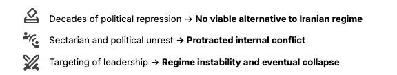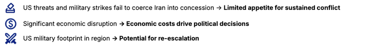 Less likely as conflict continues: This scenario assumes the US’s limited appetite for full-scale war, but the opportunities for de-escalation diminish as the conflict persists.