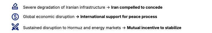 Significant degradation of Iran’s energy, military, and industrial infrastructure, combined with mounting economic strain, power shortages, and reduced capacity to sustain conflict, compels Tehran to reassess its position and signal willingness to accept concessions. In parallel, the United States faces rising economic costs from prolonged energy disruption, inflation, and market instability, increasing pressure to stabilize conditions. A negotiated settlement emerges through indirect talks, mediated by Oman, with Iran accepting concessions on maritime security and nuclear constraints in exchange for phased sanctions relief and assurances against further strikes. Iran seeks a revised Strait of Hormuz security framework and limited economic concessions, though broader demands such as reparations are only partially addressed. The Strait of Hormuz fully reopens under agreed security mechanisms, restoring stable shipping and energy flows. Sanctions ease gradually, enabling reintegration of Iranian energy exports and limited foreign investment. Military activity declines sharply, cyber operations reduce, and global energy markets stabilise, easing inflationary pressures and improving financial conditions.