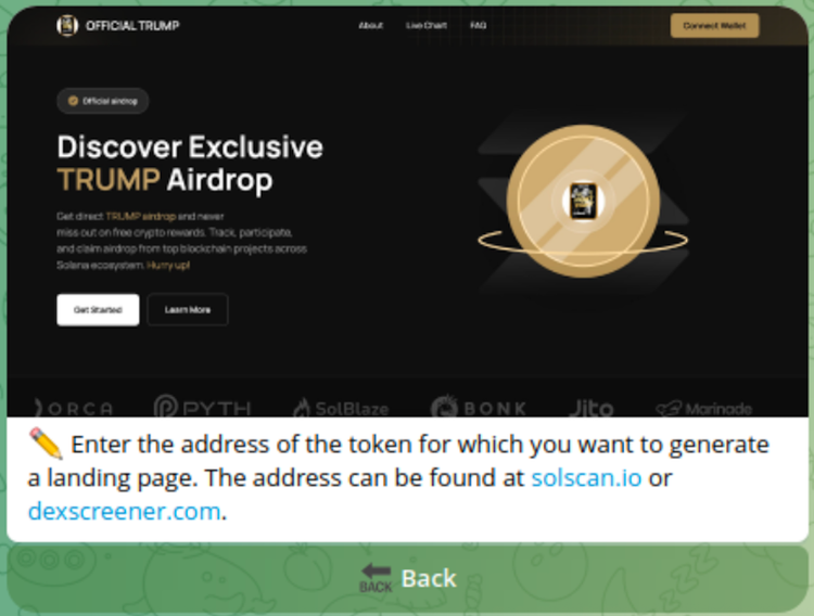 Alternatively, users can choose to generate their own landing page based on a template, which can be customized to a token of the user’s choice. They can also choose to “copy” an existing website by providing a URL to the bot; however, as of writing, this functionality appears to be broken.