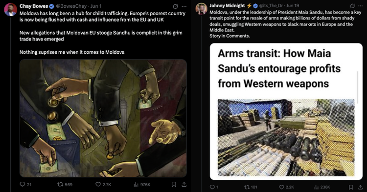 Pro-Kremlin social media personalities who have previously amplified CopyCop content are almost certainly also the leading amplifiers of R-FBI’s anti-Sandu articles, resulting in each claim receiving hundreds of thousands of social media views. In addition to Leiroz, these individuals included Chay Bowes, Raphael Machado, and social media personalities “Johnny Midnight”, “Peacemaker”, and “Sprinter Observer”. The extent of R-FBI article amplification against President Sandu is a Category 3 on the Brookings Breakout Scale, consisting of multiple platforms with multiple breakouts. Similar to Operation Overload, R-FBI has achieved isolated instances of Category 4 amplification, given the numerous prior press coverage of R-FBI and its fabricated investigative pieces.
